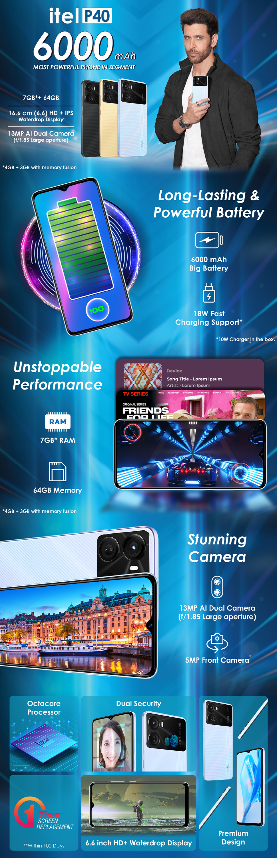 * This Itel P40 Mobile Phone image is for illustration purpose only. Actual image may vary.
