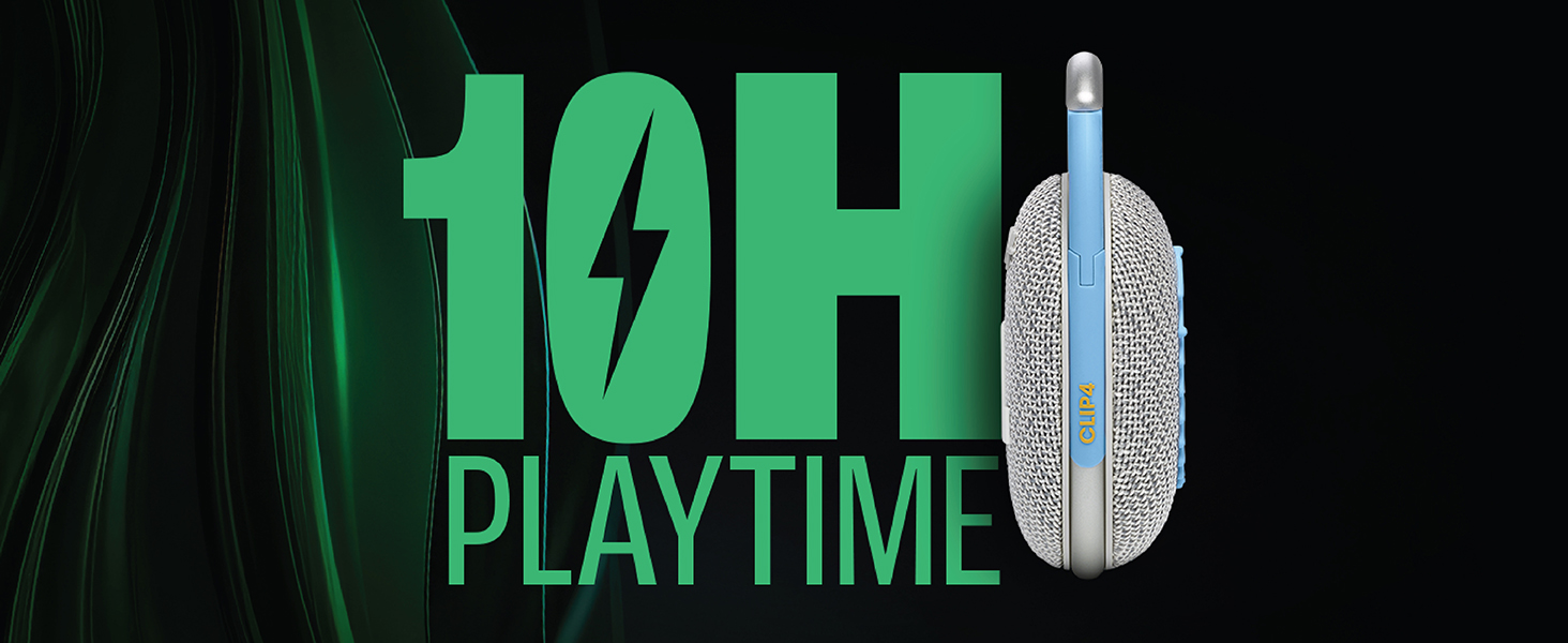 - 10 hours of battery life Don’t sweat the small stuff like charging your battery. JBL Clip 4 Eco gives you up to 10 hours of playtime on a single charge