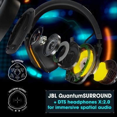 - JBL Quantum Surround with DTS Headphone X 2.0 providing Immersive Surround Sound Experience