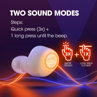 Enjoy Two different Sound Modes to suit your mood. Activate the dual sound modes by 3 quick short press and a long press on either earbud