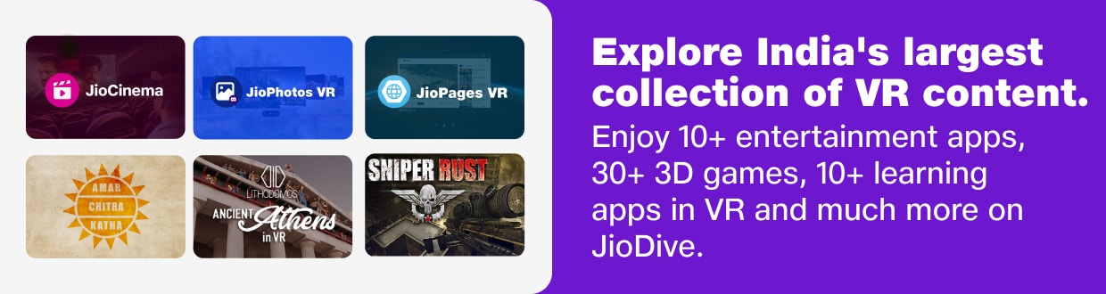 You can navigate effortlessly in the virtual environment on JioDive with the gaze-and-click interaction feature. It helps you navigate between different VR apps and experiences on the JioImmerse app without taking your phone out of the VR headset .