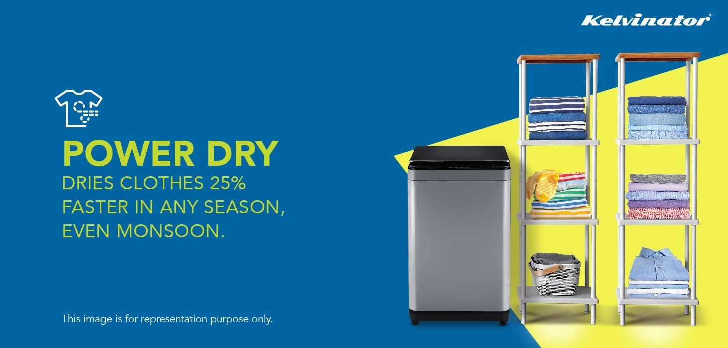 The machine dries clothes 25% faster by sucking in air as the tub spins. This process enables the washing machine to dry clothes with the same efficiency even during monsoon.