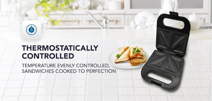 Thermostatically controlled Kelvinator Sandwich Makers maintain a constant heat temperature to ensure a near to perfect, crispy toast sandwich.