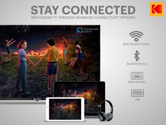 Kodak TVs gives you multiple connectivity options. This TV comes with USB 2.0, HDMI ARC/CEC and Bluetooth v.5.0, these features offer seamless entertainment. The latest version of Bluetooth gives you 2x Speed and 4x Range. With Chromecast and Airplay app, cast your android or iOS mobile, tablet or laptop on your TV screen and enjoy hassle-free entertainment.
