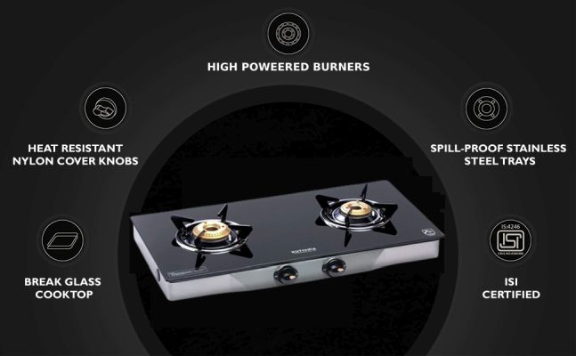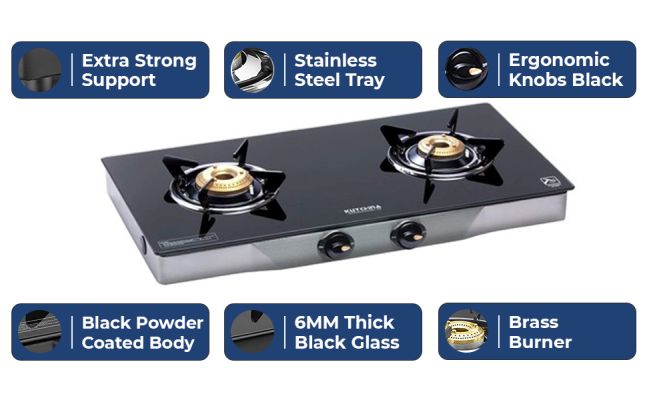 | Key Features | Brass Burner Burner Size: 69 mm and 79 mm SS Body with 6 mm Tempered Glass Euro Coated Pan Support |