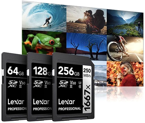 With growing HD, 3D, and 4K video capabilities, you need high-performance cards you can rely on, and high-capacity options to keep you shooting longer without changing cards. The Lexar Professional 1667x SDXC UHS-II card makes it easy by leveraging UHS Speed Class 3 (U3) performance and providing you with large capacity options up to 256GB.