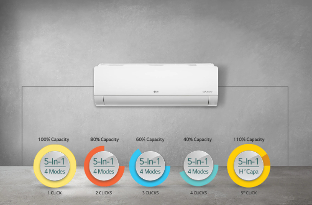 LG DUALCOOL AC with Super Convertible 5 in 1 Cooling Control, you can not only save a lot of energy by stepping down the cooling capacity from 100% to 80 percent, 60 percent or 40 percent but even increase the cooling capacity to 110 percent when faster cooling becomes most important.