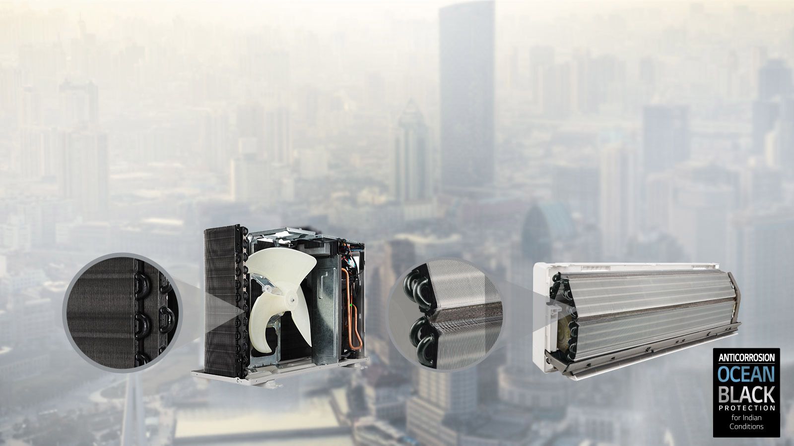 Special Ocean Black Protection applied to both Indoor & Outdoor unit provide exceptional durability for the air conditioner in typical Indian regions affected from sand, salt, industrial smoke & pollutants.