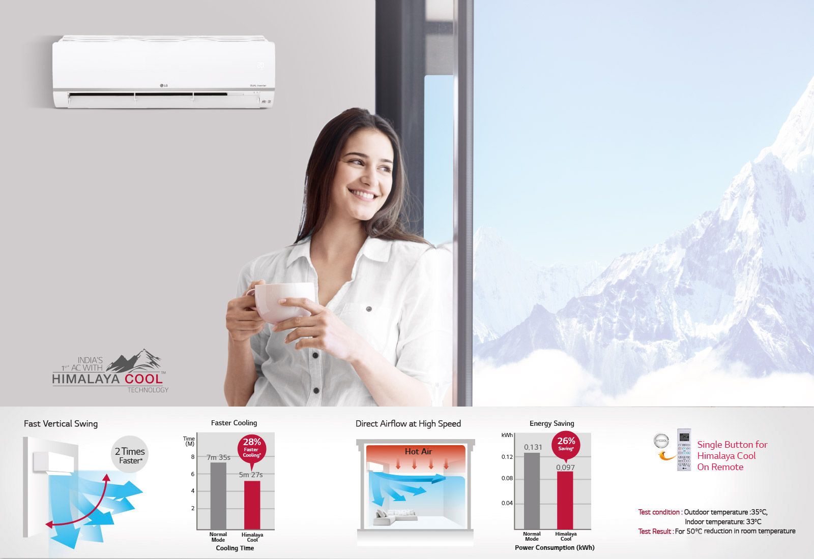LG Air Conditioners with the unique Himalaya Cool Technology promises to cool you as soon as you switch on the Air Conditioner. With just the touch of a button, you will feel as cool as in the Himalayas.
