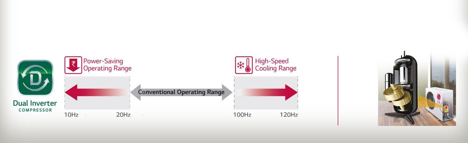 LG’s DUAL Inverter Compressor with Varied Speed Dual Rotary Motor has a wider rotational frequency which saves more energy along with higher speed cooling range than conventional compressors. This ensures that our DUAL Inverter ACs cool faster, last longer and run quieter.