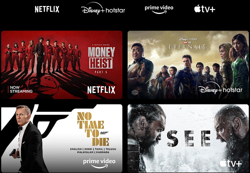 Ready for movie night. All set up for binging. Find virtually anything to watch on the available streaming apps. With Netflix, Disney+Hotstar, Amazon Prime, and Apple TV+ and many more, something exciting is always showing.