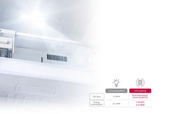 LG Door Cooling+ makes inside temperature more even and cools the refrigerator 35%^ faster than the conventional cooling system. This reduces the temperature gap between the inner part and the door side of the compartment; thus letting the food remain fresh for long.