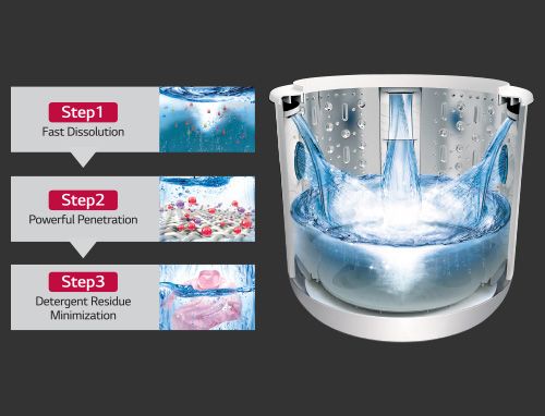 Side Waterfall mixes detergent with water effectively and minimizes detergent residue.