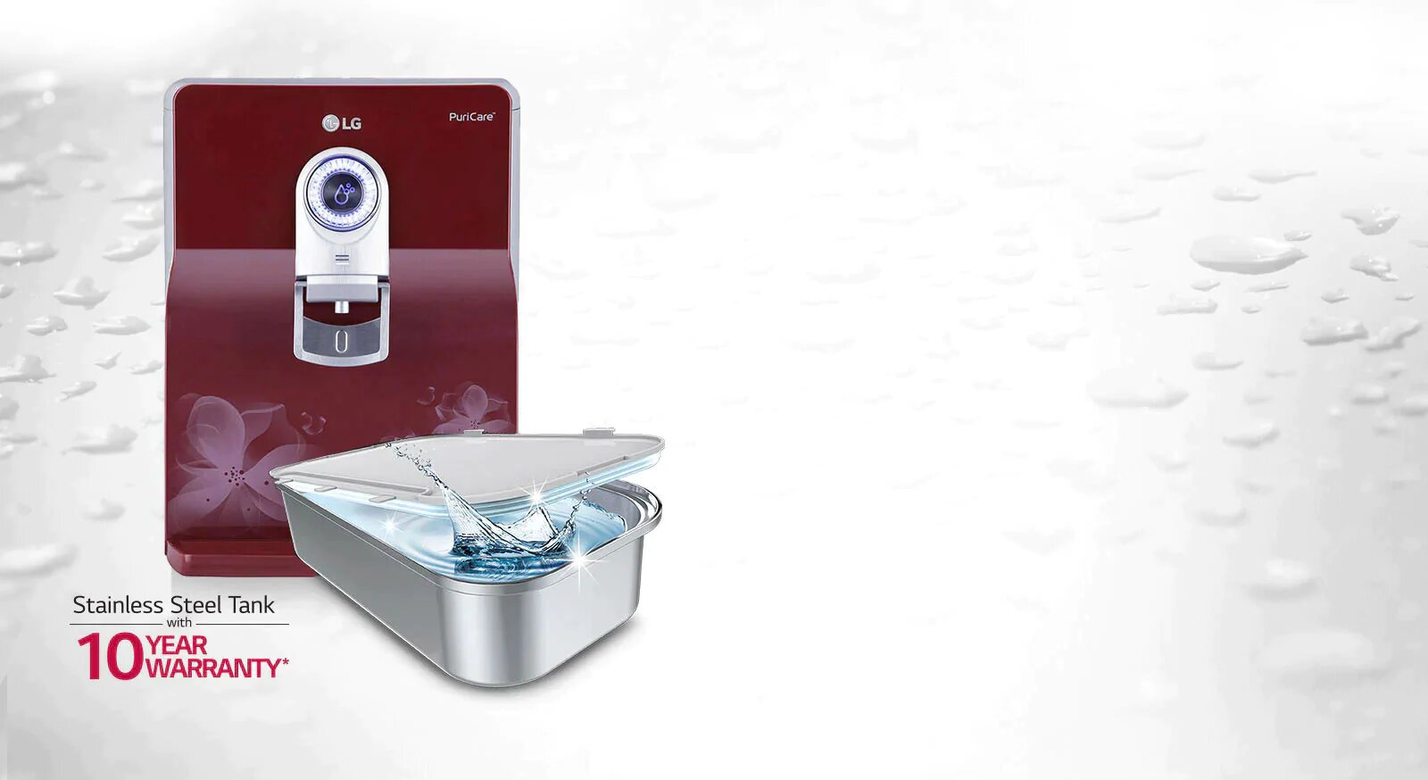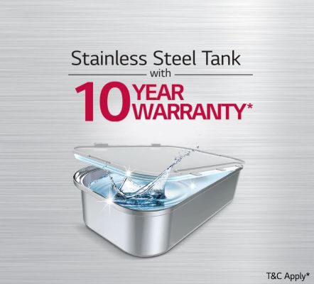 The LG water purifier's Dual Protection Stainless Steel Water Tank, maintain freshness of water and reduce the growth of bacteria and algae. Far more hygienic than a conventional plastic tank, it ensures that water remains safe for drinking with Dual Protection Seal.