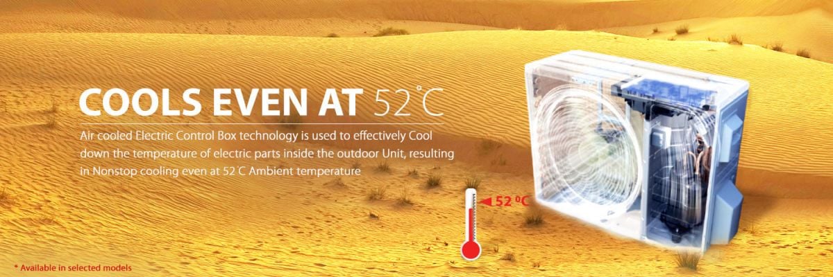 Air Cooled Electric Control Box technology is used to effectively cool down the temperature of electric parts inside the outdoor unit, resulting in nonstop cooling at 52 °C ambient temperature.