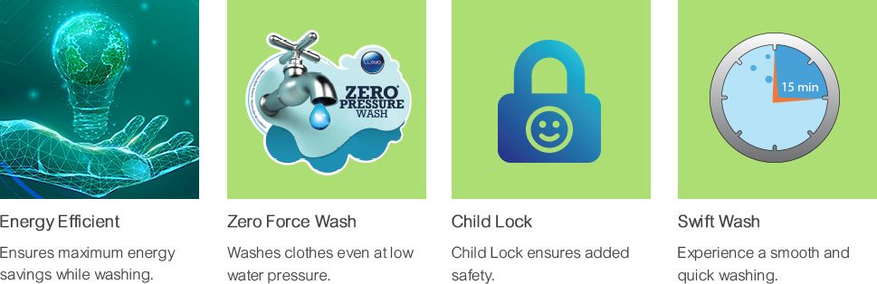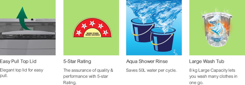 | Key Features | 5 Star Rating Washing Machine Top Loading Fully Automatic Lint Filter, Capacity: 8 Kg Max. Spin Speed: 700 RPM Automatic Water Control |