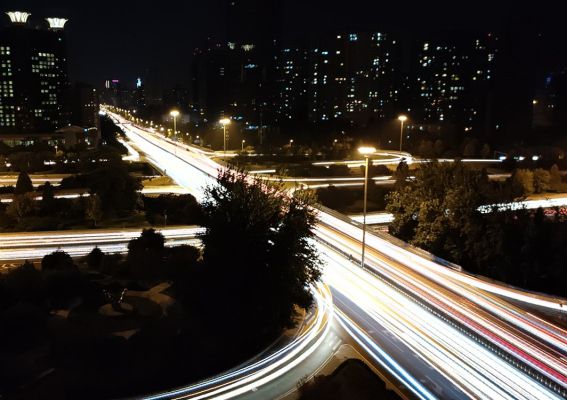Neon Trails. Trails of light from moving vehicles illuminating the night.