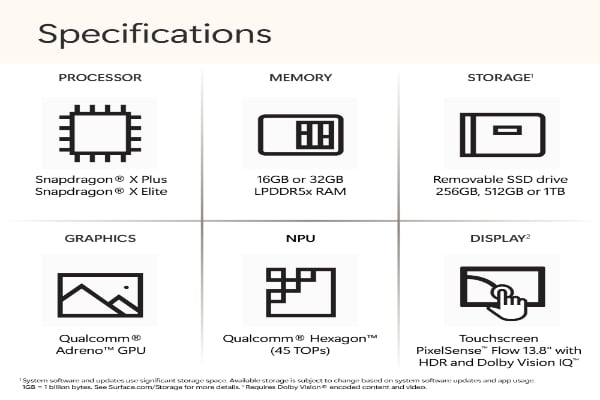 | Processor | Qualcomm Snapdragon X Plus with Qualcomm Hexagon NPU with 45 TOPS |