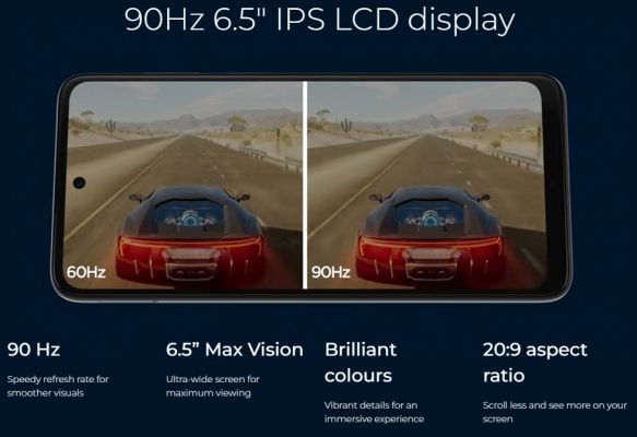 | Key Features | 16.51 cm (6.5 inch) HD+ 1600 x 720 Display 50 MP + 8 MP + 2 MP + 2 MP Primary camera 16 MP Selfie Camera 5000 mAh Lithium Ion Battery Android 12 operating system Side fingerprint reader, Face unlock MediaTek Helio G37 processor, Water-repellent design |