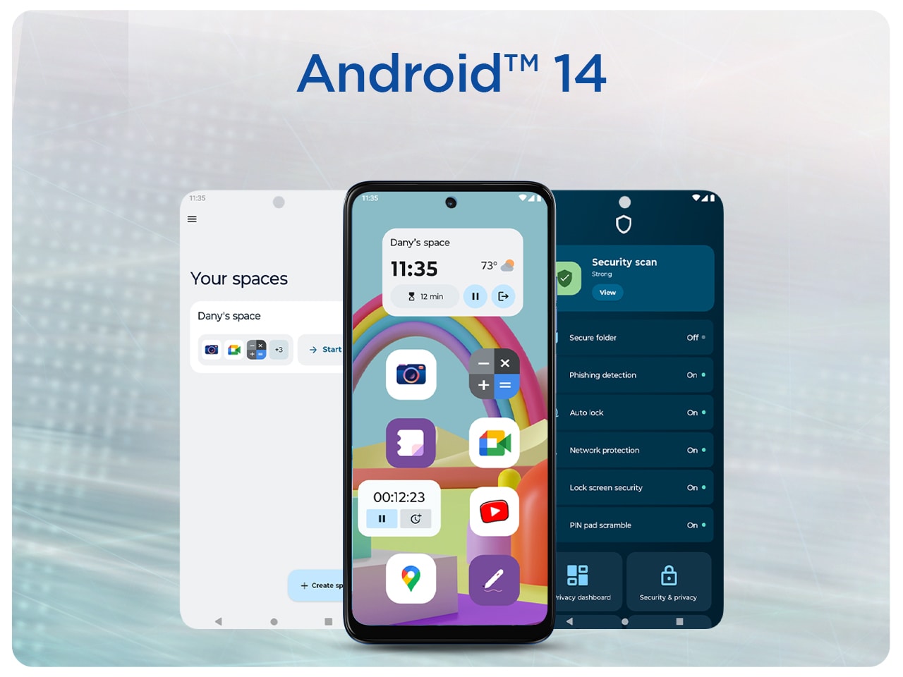 Android 14 enhances personalization, privacy, and accessibility. Moto Secure ensures your data's safety. My UX offers intuitive control and customization. Family Space provides a secure environment for kids.
