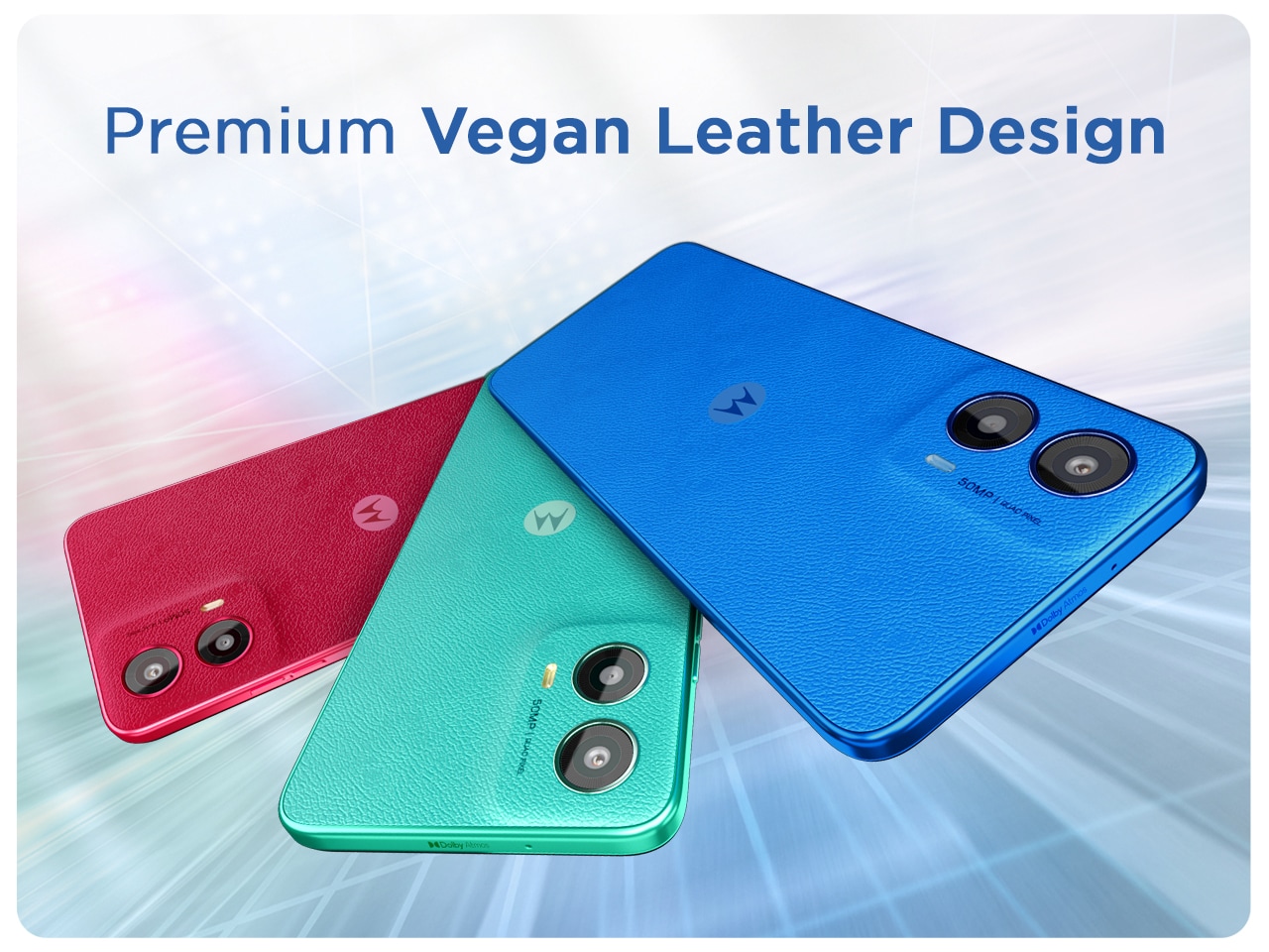 Stand out with the moto g45 5G's slim, sleek, and stylish vegan leather finish, available in 3 beautiful colorful options. The special vegan leather edition adds a touch of elegance and provides a better in-hand feel, making you stand out. The IP52 water-repellent design ensures durability. It is super lightweight at just 183g and only 8mm thick. Available in Brilliant Blue, Viva Magenta, and Brilliant Green.