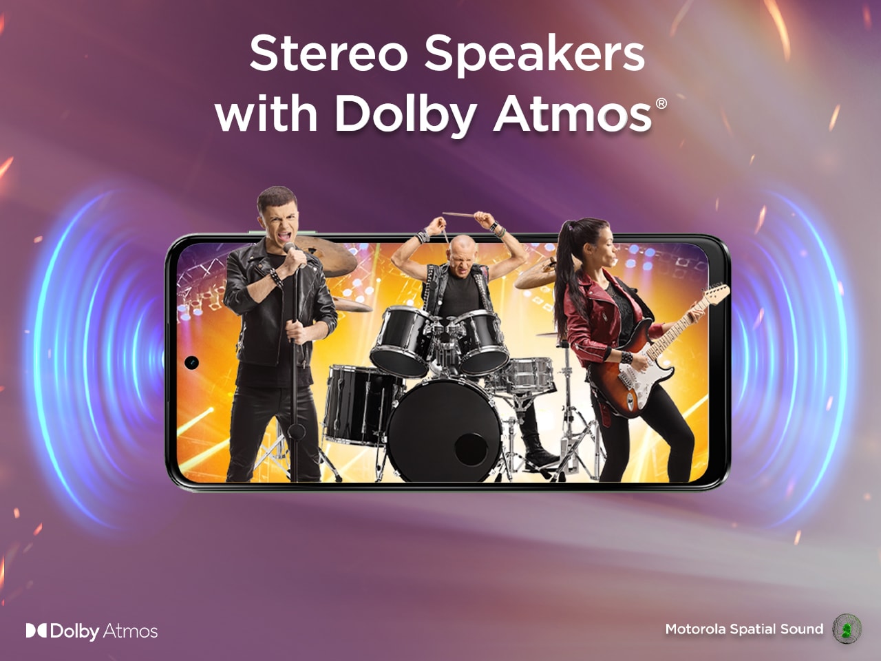 Step into a world of extraordinary sound quality. Treat your ears to premium audio output with Dolby Atmos Dual Stereo Speakers and Moto Spatial Sound technologies. Feel the depth of enhanced bass, the clarity of vocals, and the immersive spatial effects, even at maximum volume. Whether you're using headphones or not, experience a sense of depth, spaciousness, and crystal-clear sound that's tailored just for you.