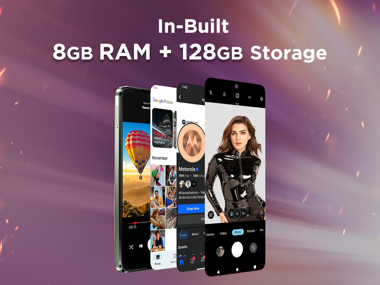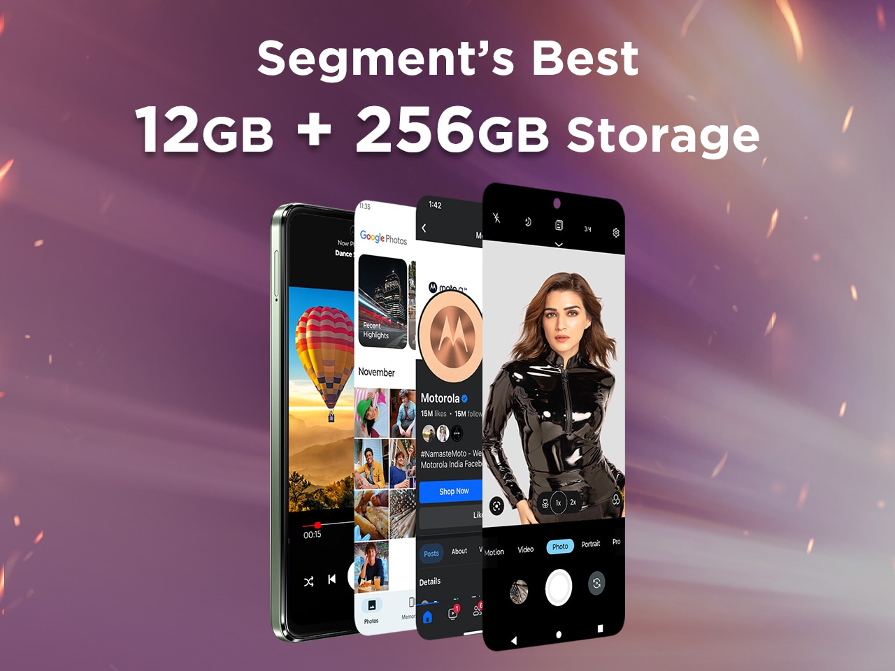 Experience smooth performance with the segment's best 12GB RAM + 256GB storage smartphone. Effortlessly navigate through your apps on the moto g64 5G that's powered by an impressive in-built 12GB of memory. Say goodbye to storage woes because with 256 GB internal storage, you have ample space for photos, movies, songs, apps, and games. This device also comes with an in-built 8GB RAM + 128GB of storage. Both variants enable smooth multitasking and provide ample space for all your multimedia content with LPDDR4X memory type and UFS 2.2 storage. Whether it's gaming, binge watching, expansive playlists, essential apps, or capturing moments the moto g64 5G can handle it all effortlessly. And if you need more space, you can expand the storage further with a microSD card of up to 1TB.