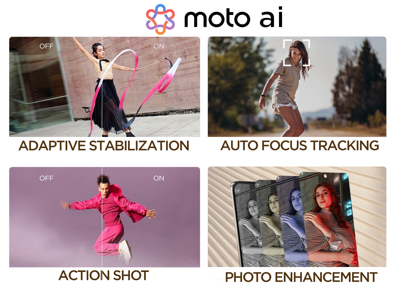 Capture life's moments on the move, effortlessly. moto ai empowers your photography with intelligent features that adapt to your every step. Imagine smooth, stabilized videos thanks to Adaptive Stabilization, which uses AI to anticipate your movements. Capture fleeting moments in stunning detail with Adaptive Shutter, as AI predicts subject movement and adjusts the shutter speed for razor-sharp photos. And say goodbye to blurry action shots – Auto Focus Tracking locks onto your subject with AI precision, ensuring they stay perfectly in focus, even as they move.