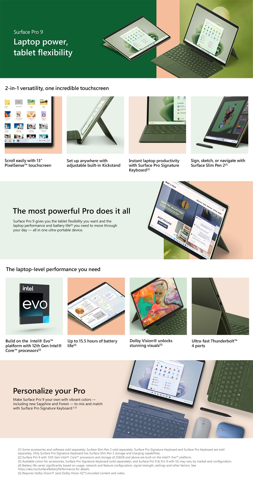 Device Protection Plan AddedNew Microsoft Surface Pro 9 Intel 12 Gen Evo i5/8GB/256GB/13 Inch/PT/W11 (QEZ-00065) Forest