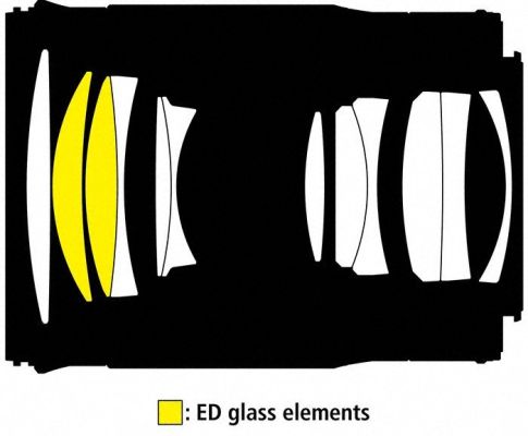 Via the employment of two ED glass elements, color bleeding that is likely to occur around the edges of subjects in high-contrast scenes is effectively compensated.