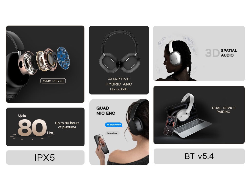 | Key Features | Up to 80 Hours of Playtime IPX5 Water Resistance 40 mm Driver Quad Mic with ENC BT v5.4 Dual-Device Pairing Ultra Low Latency (Up to 30 ms) Adaptive ANC 3D Spatial Audio |