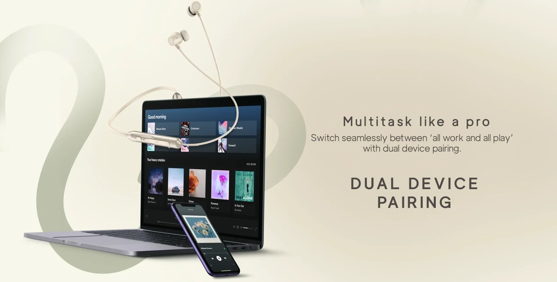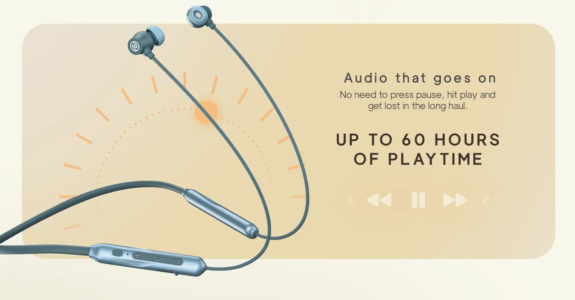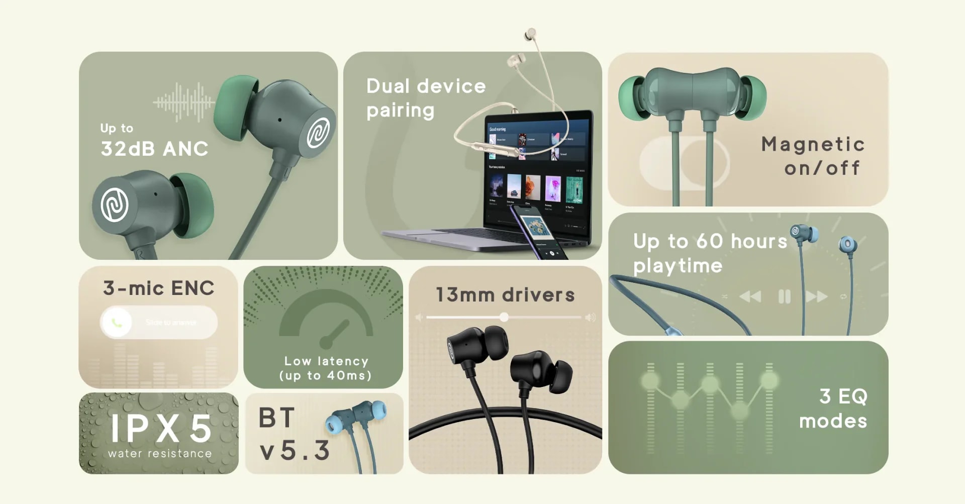 | Key Features | Up to 60 Hour Playtime 3 EQ Modes 13 mm Driver ENC for Superior Calling Low Latency (up to 40 ms) Sporty Elegant Design ANC (Up to 32 db) IPX5 Water Resistance Dual Pairing Bluetooth v5.3 |