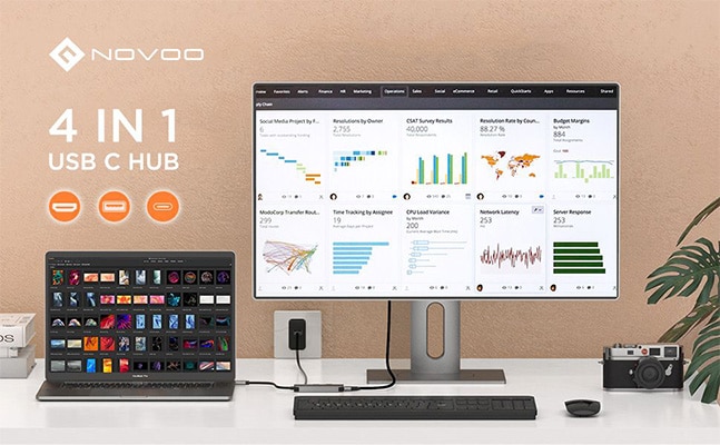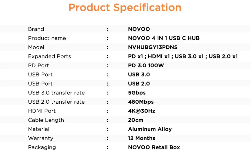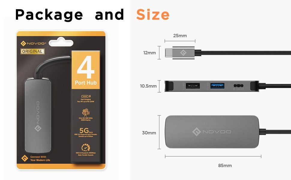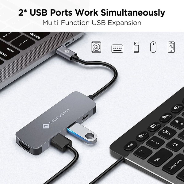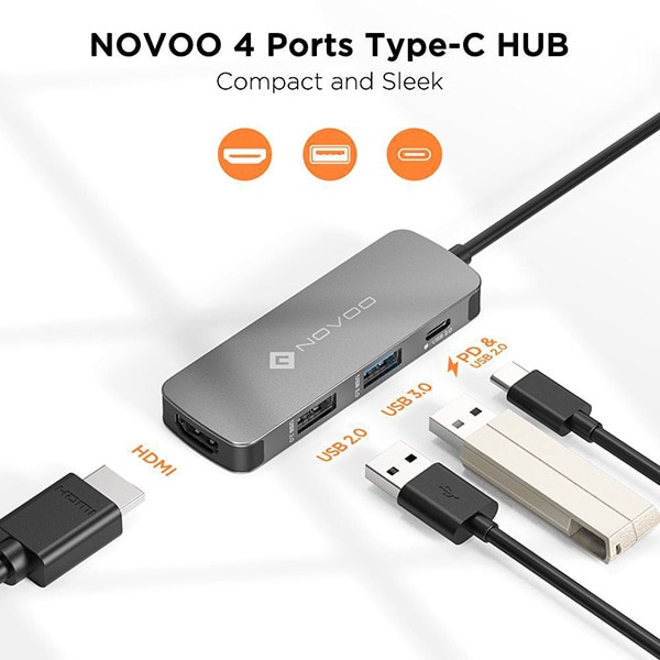 Novoo 4-in-1 USB-C Hub with USB 2.0 Port, USB 3.0 Port, USB-C PD Port, HDMI Port, Dark Grey