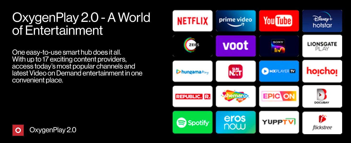 | Preloaded Apps | OxygenPlay, Prime Video, Hotstar, Netflix, Zee5, Voot, Sony Liv, LIONSGATE PLAY, Hungama Play, SUN NXT, Mx Player TV, Hoichoi, Republic R, EPICON, DOCUBAY, Spotify, Eros Now, ZuppTv |