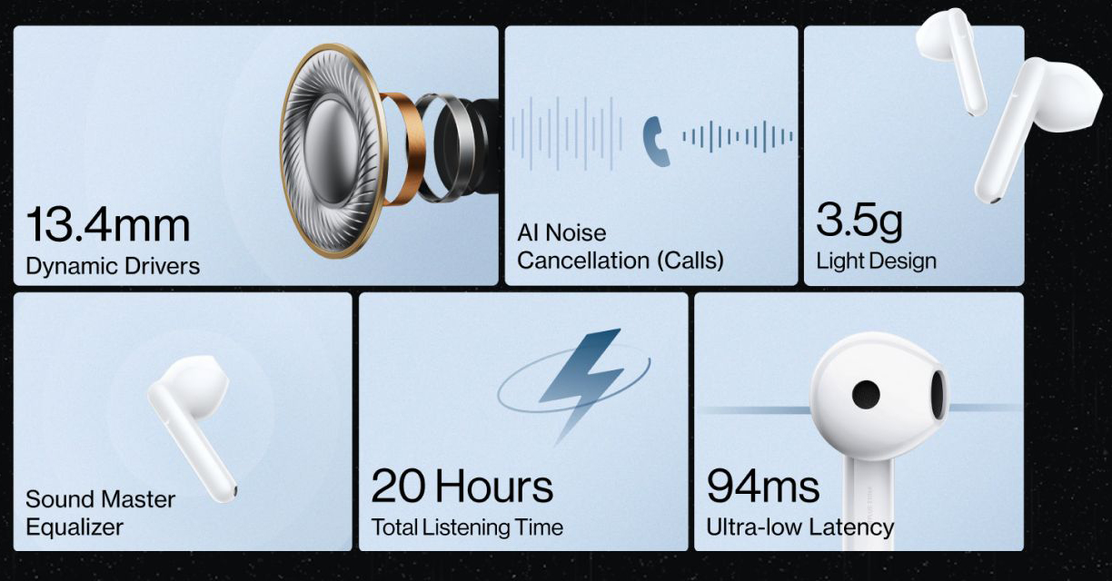 | Key Features | 13.4 mm dynamic drivers Fast Charging in 10 Mins AI Noise Cancellation (Calls) Sound master equalizer 20 hour total listening time 94 ms ultra low latency boosts the booming bass upto 3dB Music Playtime : up to 4.5 hour with the buds 20 hour with the charging case |
