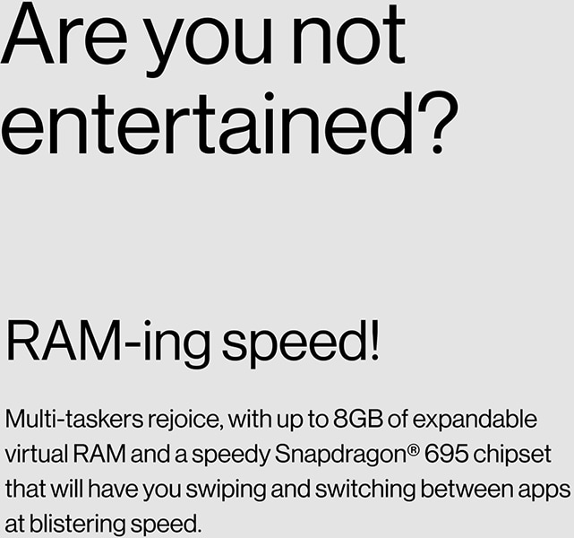 | Key Features | 8 GB RAM, 256 GB Internal Memory17.07 cm (6.72 inch), 2400 x 1080 resolution, 120Hz, LCD Display108 MP Main, 2 MP Ultra Wide, 2 MP Macro3X Lossless Zoom16 MP Front CameraQualcomm Snapdragon 695 5G5000 mAh, 80 Watts SUPERVOOC3.5mm headphone jack |