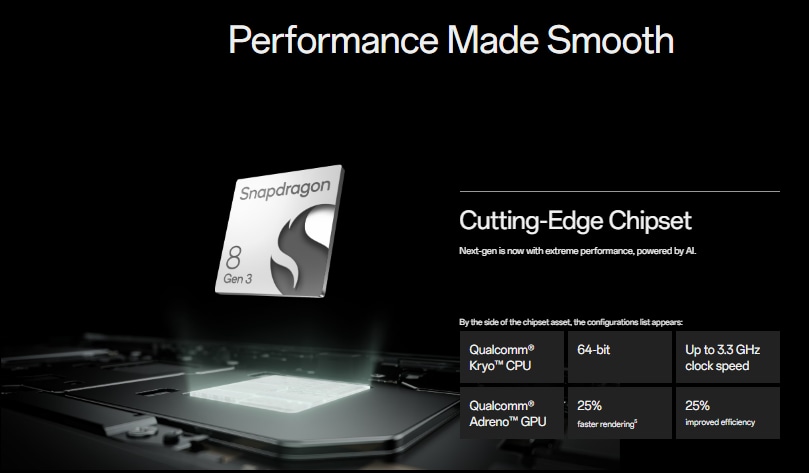 | Key Features | Rear Camera: 13 MP Front Camera: 8 MP Processor: Snadragon 8 Gen 3 Platform Processor Speed: Qualcomm Kryo up to 3.3 GHz Storage: 256 GB, 12 GB RAM |
