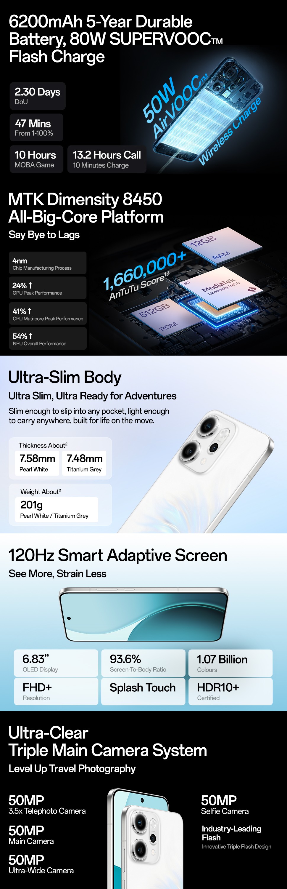 - Battery: 6200 mAh, 80 Watts SUPERVOOC