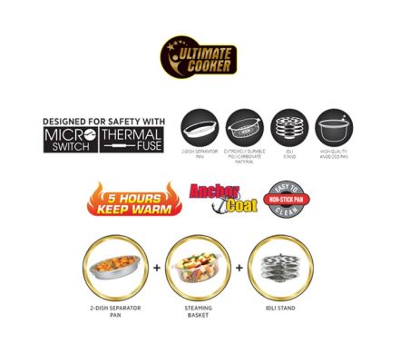 | Key Features | Comes with 2-Dish Separator Pan, Steaming Basket and Idli Stand Automatic Cooking 5 Hrs Keep Warm Function Anodized Aluminium Pan |