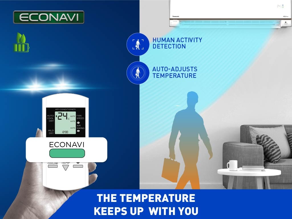 ECONAVI has two sensors; the Human Activity Sensor and the Sunlight Sensor. Together, they monitor human location, movement, absence, and sunlight intensity to use energy more efficiently. By adapting to the way you live and optimizing operation, this unique feature makes the air conditioning in your home more energy efficient.