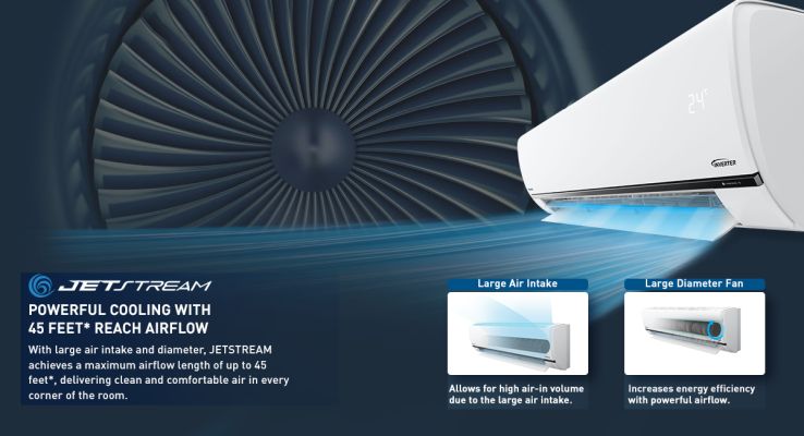 Powerful cooling with 45 Feet reach of airflowWith large air intake and diameter, Jetstream achieves a maximum airflow length of upto 45 feet, delivering clean and comfortable air in every corner of the room.