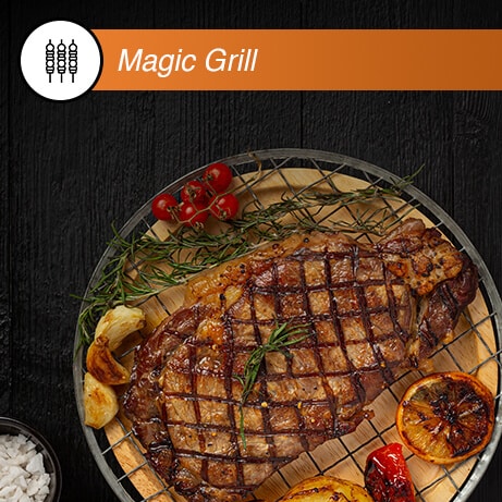 MAGIC GRILL The dual power of the top and back grill working simulataneously to make food crispier on the outside and delicious on the inside