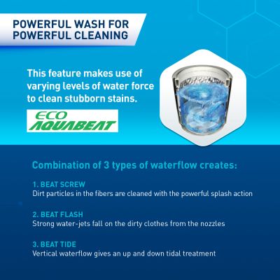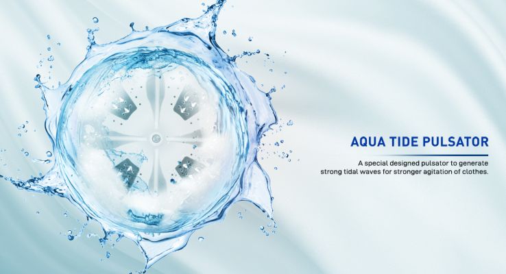 Powerful scrub wash effect with Aqua Tide Pulsator. It has 6 wings that create a powerful vertical water flow in the tub. This intense wave of water repeatedly moves cloths up and down for a scrub wash effect that removes stubborn stains. Along with the hot water, the effect of strong water flow multiplies, thus resulting in the effective removal of stains.