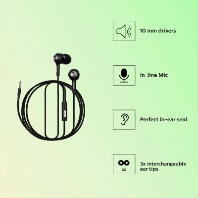 | Key Features | Enjoy quality sound: Perfect in-ear seal blocks out external noise Designed around you: Integrated microphone and call button Use them for longer: 3 interchangeable rubber ear caps for optimal fit in all ears Always ready to go: A 1.2 m long cable that is ideal for outdoor use, rubberized cable relief enhances durability |