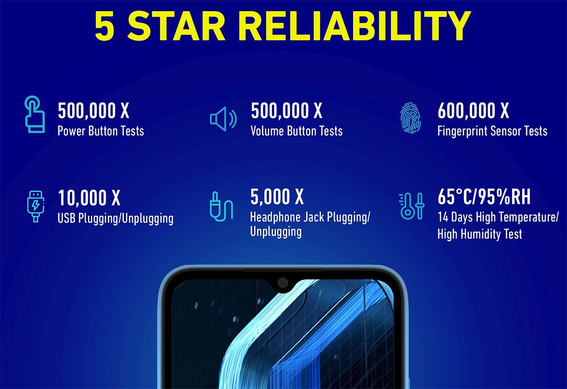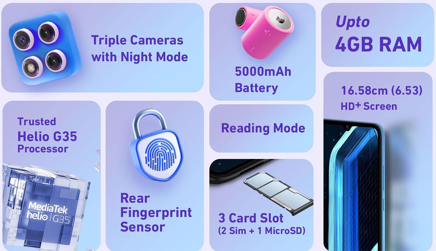 | Key Features | 16.59 cm (6.53) Incell LCD Waterdrop 1600 x 720 Display Mediatek Helio G35 processor, Android 10 OS 5000 mAh (typ) battery, 5 MP Selfie Camera Primary Camera: 13 MP + 2 MP + 2 MP 3.5mm audio jack, Micro USB Port, Fingerprint sensor |