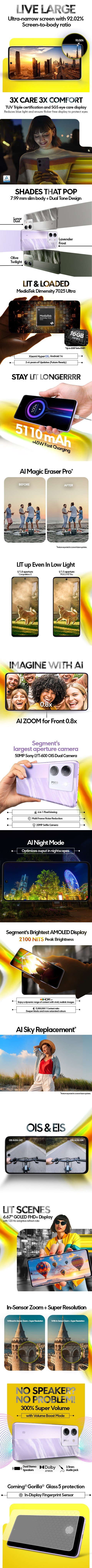 | Key Features | Storage: 8 GB RAM, 256 GB Internal Memory, Expandable Upto 1 TB Display: 16.94 cm (6.67 inch), 2400 x 1080 Resolution, 120Hz FHD+ gOLED Rear Camera: 50 MP Main Camera, 2 MP Front Camera: 20 MP Processor: Mediatek Dimensity 7025-Ultra Battery: 5110 mAh, 45 Watts Charging Fingerprint Recognition: In Display Water Resistant: IP52 |
