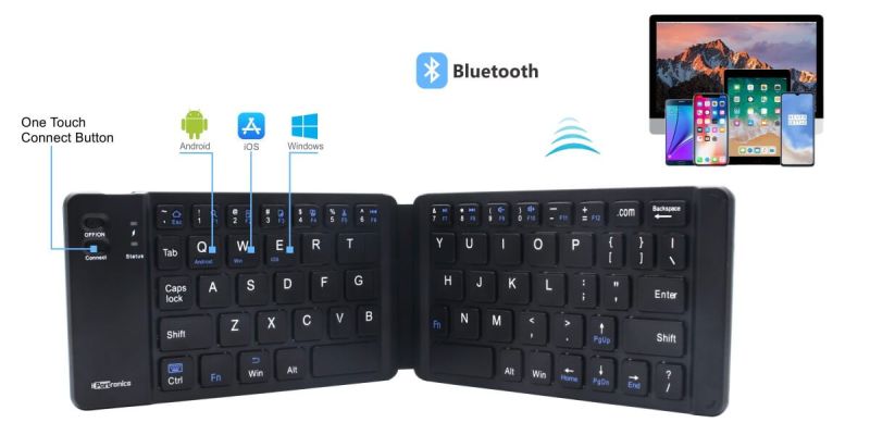 Simply pair this keyboard with your gadget via Bluetooth. You don’t need to install any software. Compatible with 3 major operating systems iOS/Windows/Android Supports most Bluetooth-enabled devices. Folding design provides more convenience. Standard-size keyboard improves typing efficiency and comfort when working outdoors or traveling. Silent typing design allows you to focus more on your work.