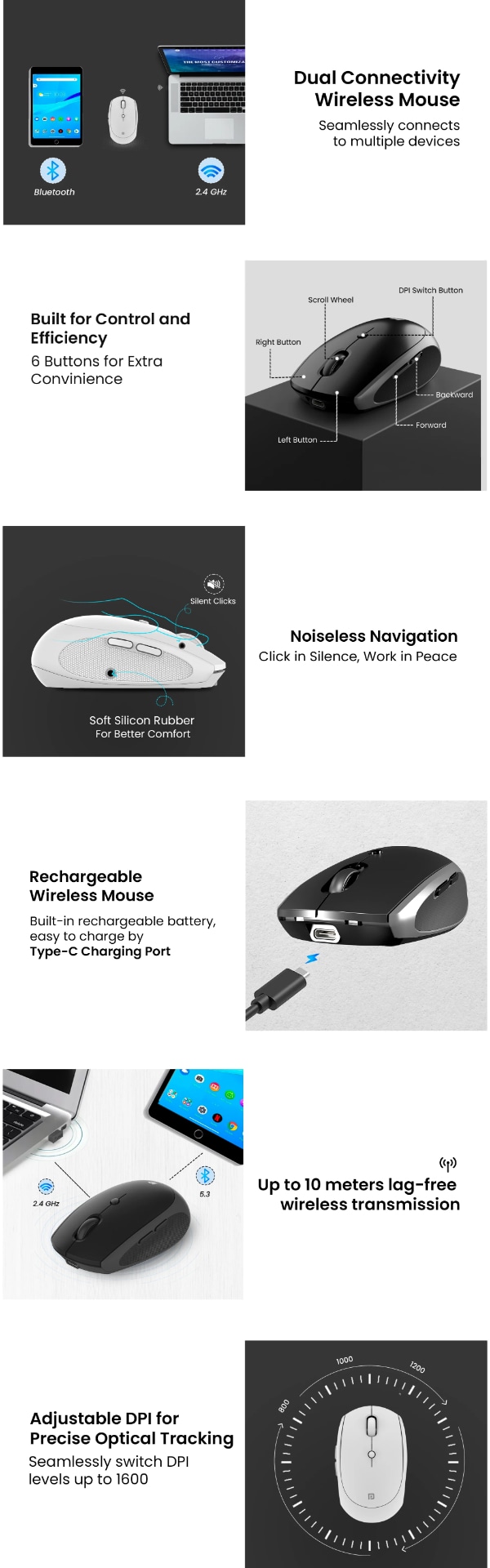 | Key Features | Bluetooth & 2.4 GHz Wireless mouse 6 Buttons Design Rechargeable Battery Multi-Device Pairing Dynamic RGB Lights Adjustable DPI Ergonomic Grip |