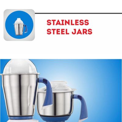 Preethi blue leaf platinum mixer grinder houses 3 stainless steel jars. These jars are made using high quality stainless steel and high precision for best performance. These stainless steel jars undergo 72 hours long salt spray test to ensure its rust proof quality. They also go through water load test to ensure stability and endurance.