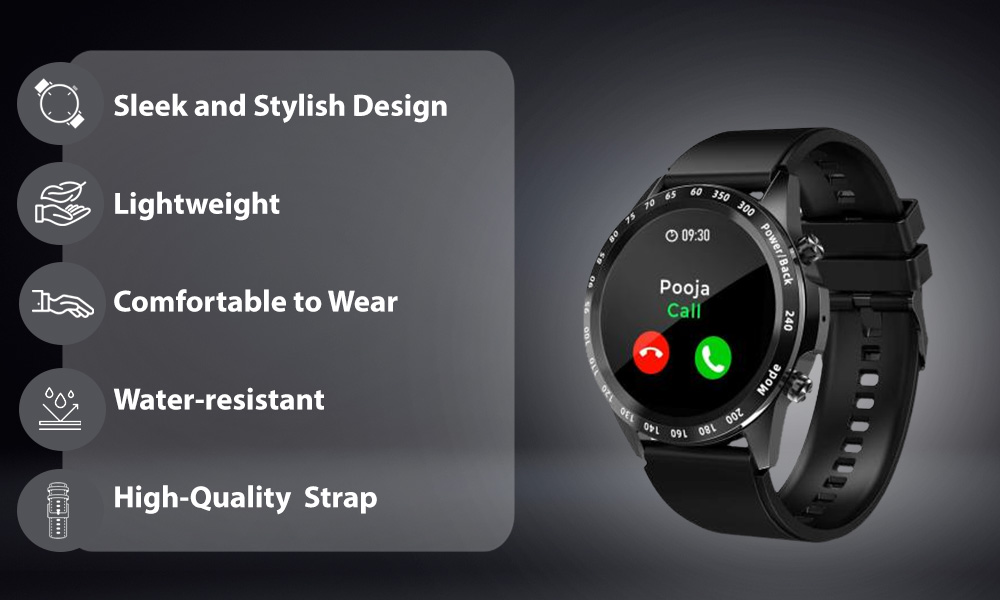 - Smart features. Touch control smartwatch, smart notifications on your wrist, listen to music on the watch, camera remote control, raise and wake display, weather info, find the watch, stopwatch and alarm